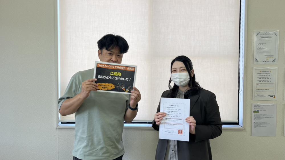 この度はコガネイハウジンング古河店をご利用いただき誠にありがとうございます。 法人様にも弊社でご担当できるようにと掛け合ってくださり心より感謝申し上げます。 奥様と大変仲がよろしく私までとても楽しい気持ちでご案内させていただきました。 ご入居後もお2人にとって笑顔溢れる暮らしとなるよう心よりお祈り申し上げます。 ご入居後も何かございましたらお気軽にお申し付けください。